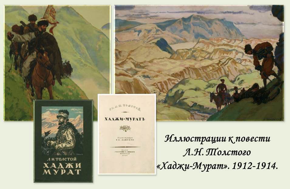 Но наивысшего расцвета иллюстративная деятельность художника достигла в годы работы над оформлением произведений Л.Н. Толстого «Хаджи-Мурат» и «Казаки». Художник-иллюстратор загорелся идеей создания «нового цельного искусства книги», осознавая органическую связь текста с иллюстрациями.