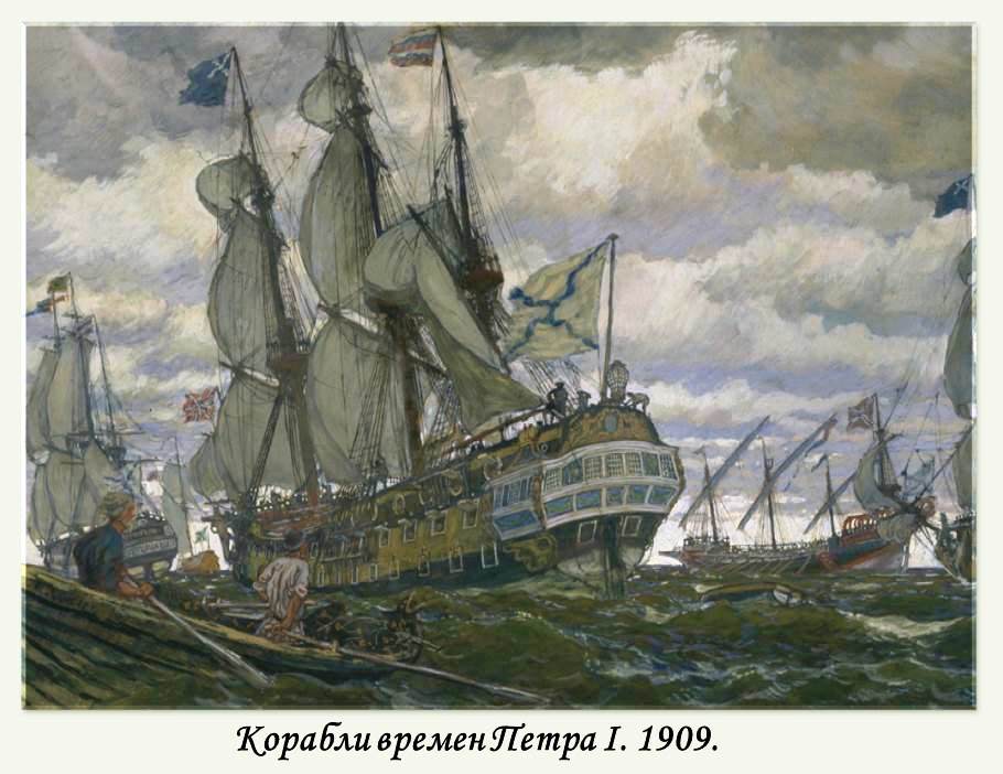 «Корабли времен Петра I» были созданы Лансере по заказу московского издателя И. Кнебеля для серии «Картины по русской истории». Легкие корабли и быстрые галеры, скользящие по зеленым балтийским водам c развевающимися флагами и вымпелами – это воплощение могущества петровской России, ее молодого военно-морского флота. Художник блестяще передает атмосферу эпохи петровского царствования, времени грандиозных преобразований, энергичного созидания и военных триумфов.