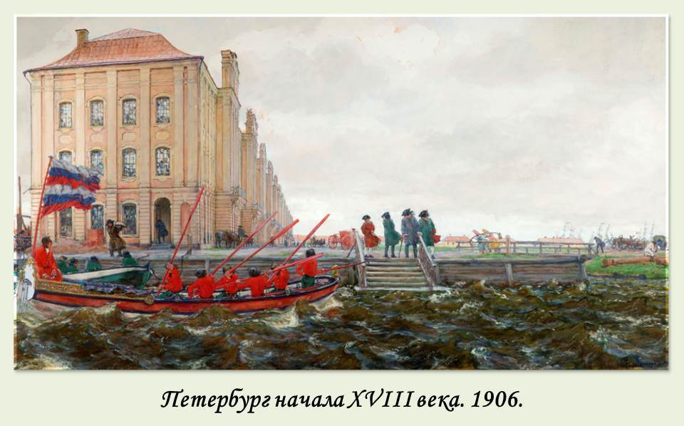Вместе с ранее исполненными композициями «Ботик Петра I» (1903) и «Петербург начала XVIII века» (1906) «Корабли времен Петра I» создают своего рода сюиту, воспевающую Петербург как морскую столицу, а Петра I как создателя русского флота.