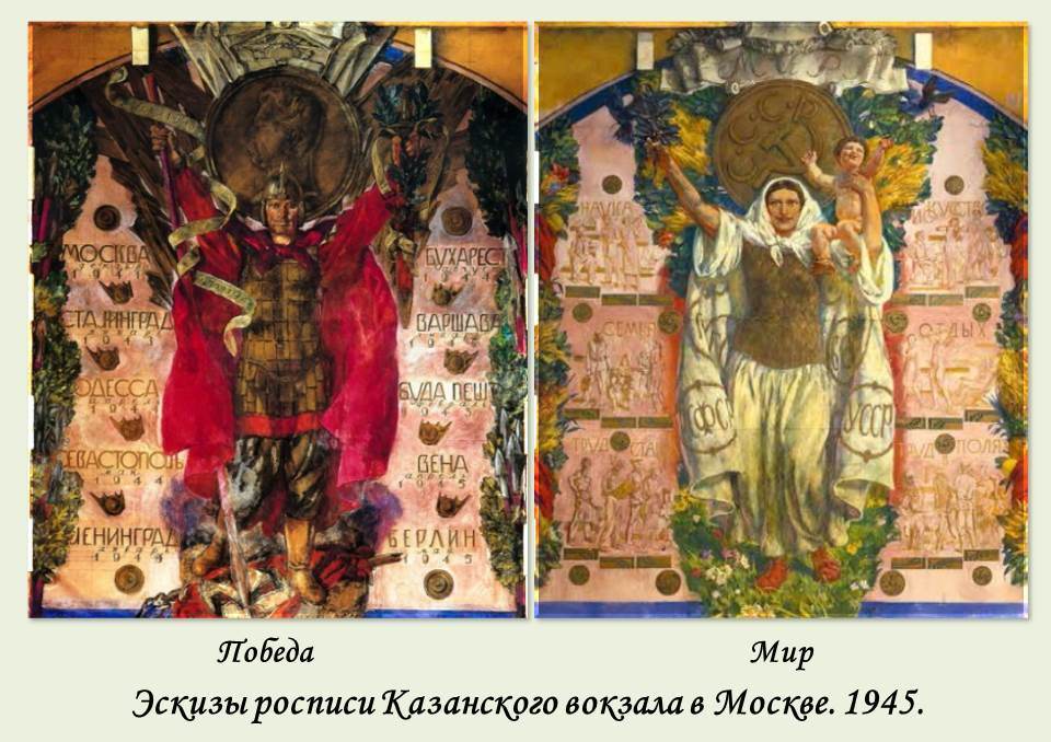 Весной 1945 г. 70-летний Евгений Евгеньевич Лансере приступил к очередному этапу по росписи Казанского вокзала – светлым, радостным панно «Победа» и «Мир». Воин в доспехах и развевающемся красном плаще символизирует Победу, а вокруг женщины с ребенком на руках располагаются многофигурные композиции, отражающие мирную жизнь. К сожалению, 13 сентября 1946 года художник умер, не закончив своих последних работ.