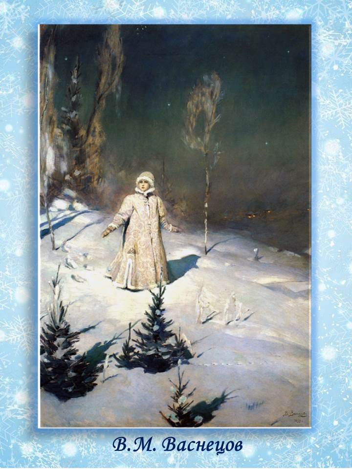 Картина «Снегурочка» 1899 года – самое задушевное произведение художника. Сказочно красивая ночь: заснеженный лес, залитый лунным светом, звездное небо. Снегурочка только что вышла из леса и растерянно осматривается по сторонам. Она одета в старинную русскую шубу, ее фигура и все, что ее окружает, выполнены в излучающих чистоту бело-голубых тонах. Художник воплотил в ней не просто сказочный персонаж, а образ «чистой заснеженной России», которую любил всей душой. Снегурочка робко ступает по свежему снегу, она взволнована, на ее лице смятение. Но вдали светятся огни деревни, и она готова сделать первый шаг навстречу людям.