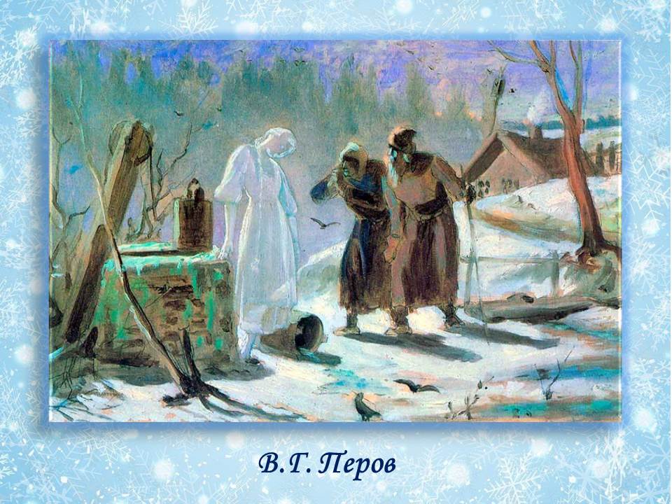 Василий Григорьевич Перов в 1879 году создал целую серию эскизов по мотивам русских народных сказок: «Весна-красна и Снегурочка», «Снегурочка», «Тающая Снегурочка». Тема для него очень необычная, ведь он был убежденным «передвижником» и в основном известен любителям живописи по картинам острой социальной направленности.
