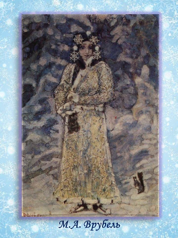 Природа на картинах Врубеля всегда так же одухотворена, как и люди. Стеной стоит сказочный зимний лес за спиной героини. Снегурочка на фоне еловых ветвей, покрытых пушистым снегом, выглядит хозяйкой, она не боится ни холода, ни темноты. У ее ног сидит белка, покинувшая густую лесную чащу, чтобы проводить Снегурочку.