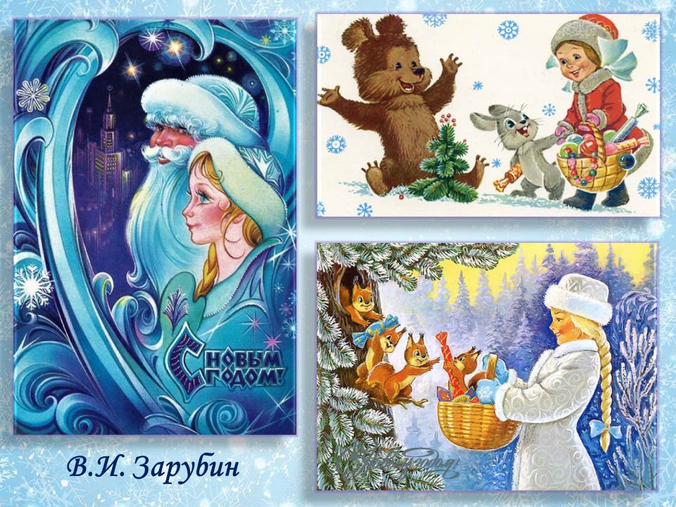 Зарубинские открытки отличались неповторимой творческой манерой, они быстро запоминались. Это был новый и свежий взгляд на почтовую миниатюру. На его ярких, добрых, праздничных изображениях вместо людей – забавные животные, которые поздравляют друг друга, готовят подарки, устраивают сюрпризы. И сказочные Снегурочка и Дед Мороз кажутся реально существующими! Зарубин сумел соединить заснеженный лес, улыбчивую Снегурочку с корзинкой подарков и веселых зверюшек с озорными улыбками.