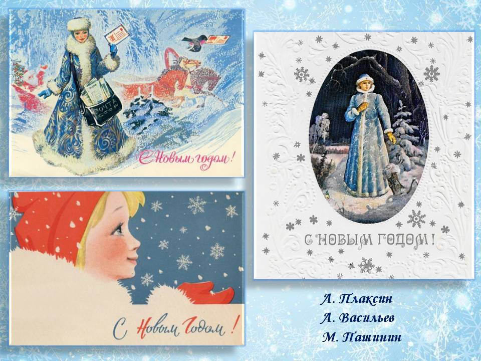 На советских открытках Снегурочка становится вестницей Нового года, приносящей поздравления и весточки от близких. Непременные спутники прекрасной Снегурочки – елочки, снежинки, зайчики, белочки, снегири и синички. Многим запомнились и полюбились открытки художников В. Зарубина, М. Пашинина, Н. Коробовой, А. Плаксина, А. Васильева.