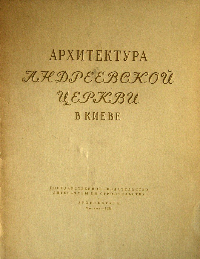 Безсонов, С. В. Архитектура Андреевской церкви в Киеве / С. В. Безсонов; Академия архитектуры УССР, Институт истории и теории архитектуры. – Москва : Государственное издательство литературы по строительству и архитектуре, 1951. – 22 с., 21 л. ил. : ил.