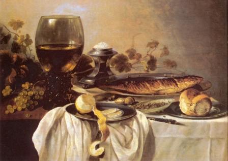 Питеру Классу принадлежит честь открытия тона и световоздушной среды как главнейших средств выявления единства предметного мира. Он создал жанр так называемых «монохромных завтраков». Вносимый Классом мотив незавершённости трапезы как будто оживляет натюрморт: надломленная булочка, наполовину очищенный лимон, расколотый орех, недопитый бокал, рассыпанный виноград, смятая скатерть – всё говорит о недавнем присутствии человека, отражает его вкусы и образ жизни.