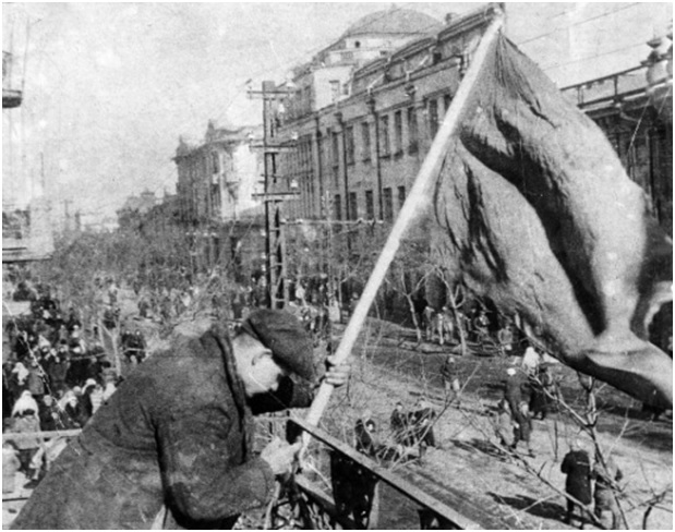 На башне здания крайкома ВКП(б), на углу улиц Красной и Ворошилова (ныне ул. Гимназическая), бойцы взвода конной разведки лейтенанта Крапивы 121-го горнострелкового полка 9-й горнострелковой дивизии Д. Васюков, Х. Адалгиреев, Р. Абрамян ранним утром установили красный флаг.